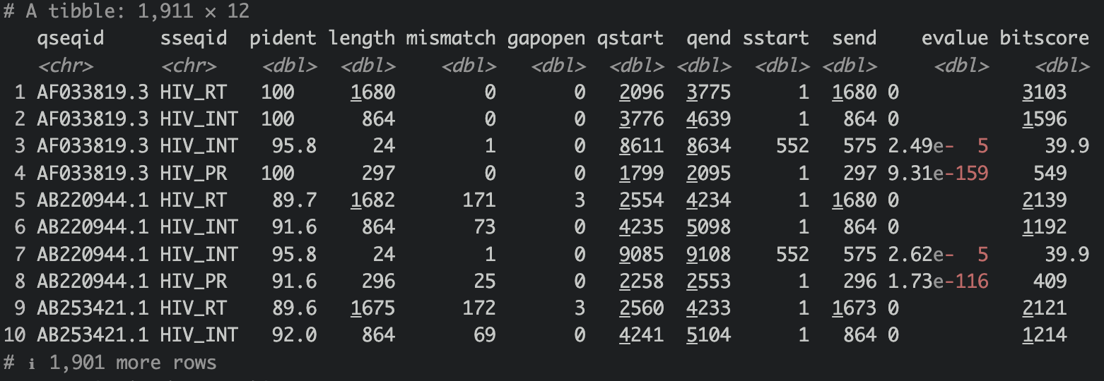 (all_hiv_sample <- read_tsv("hiv_sample_blast_results.txt", col_names = colnames))