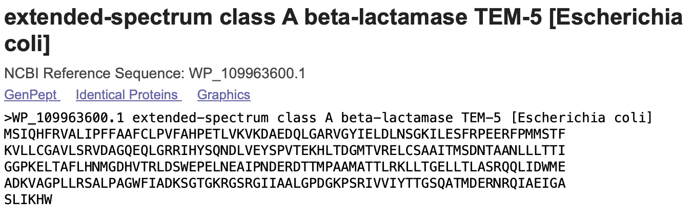 Copy the protein sequence and we’ll move on to our next step. Also don’t forget to copy the other proteins of interest, in our case TEM-30, CTX-M-15, and KPC2.